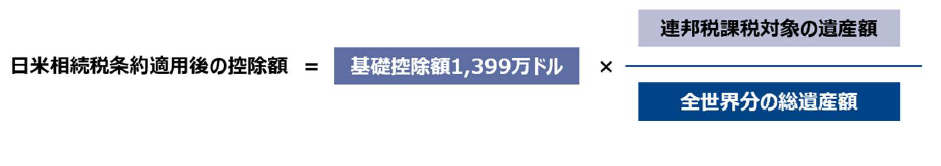 連邦遺産税の基礎控除額は日本の相続税と比較して大きく、米国市民や居住者の基礎控除額は2025 年では1,399 万ドルであるため、納税義務が生ずる対象者が少ないことから米国では節税対策よりもプロベート対策が一般的に行われています。米国非居住者の基礎控除額は6 万ドルと米国居住者と比較して少額ですが、日米相続税条約(正式には「遺産、相続及び贈与に対する租税に関する二重課税の回避及び立つ税の防止のための日本国とアメリカ合衆国との間の条約」)において、相続人が日本居住の無制限納税義務者である場合において、被相続人の遺産が米国内にあることのみをもって連邦遺産税が課されたときは、その被相続人に対して米国居住者相当の基礎控除額を適用することとされています。具体的には米国居住者に適用される基礎控除額に米国内で連邦遺産税の課税対象となる遺産額の被相続人の全世界分の総遺産額の割合を乗じて計算した金額が基礎控除額となります。
