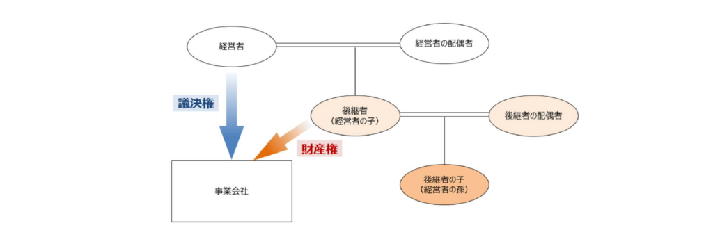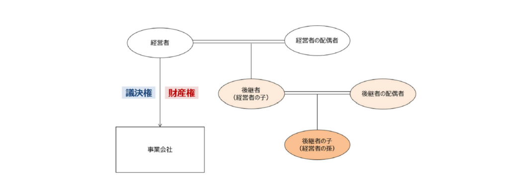 2.の前提において、仮に、創業者である経営者から贈与等によって事業会社株式の現物を後継者に直接保有させたとき、万一、後継者に相続が発生した場合には、被相続人(後継者)の配偶者と子が相続人となります。従って、後継者の配偶者と後継者の子が事業会社株式を相続することになります。