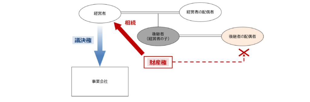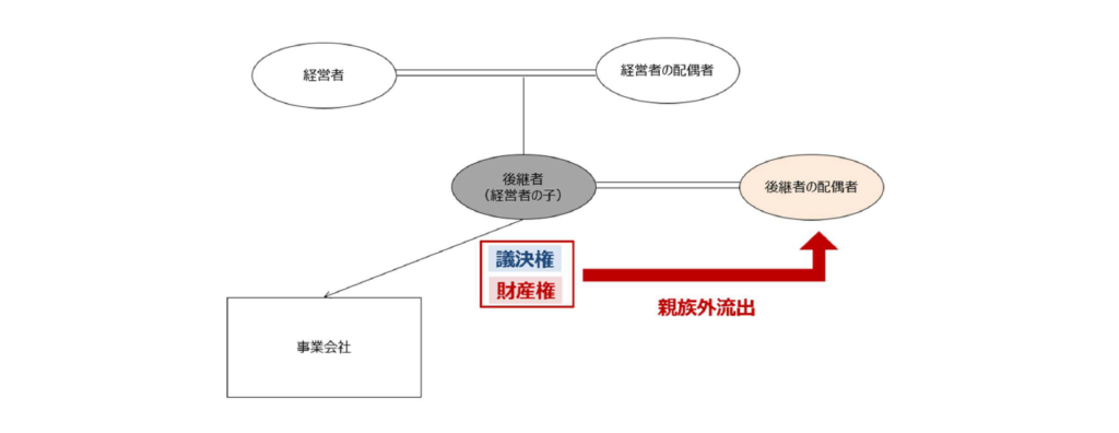 このような場合に、その後継者に「相続」が発生することをきっかけに、後継者が保有していた事業会社株式がその「後継者の配偶者」に相続されることによって、その事業会社株式が創業者である経営者の一族(直系卑属)から流出してしまい、それまで「株主=経営者」であった関係が「株主≠経営者」となり、ビジネスに関与しない者が株主となることで経営に悪影響を及ぼしてしまう可能性もゼロではありません。